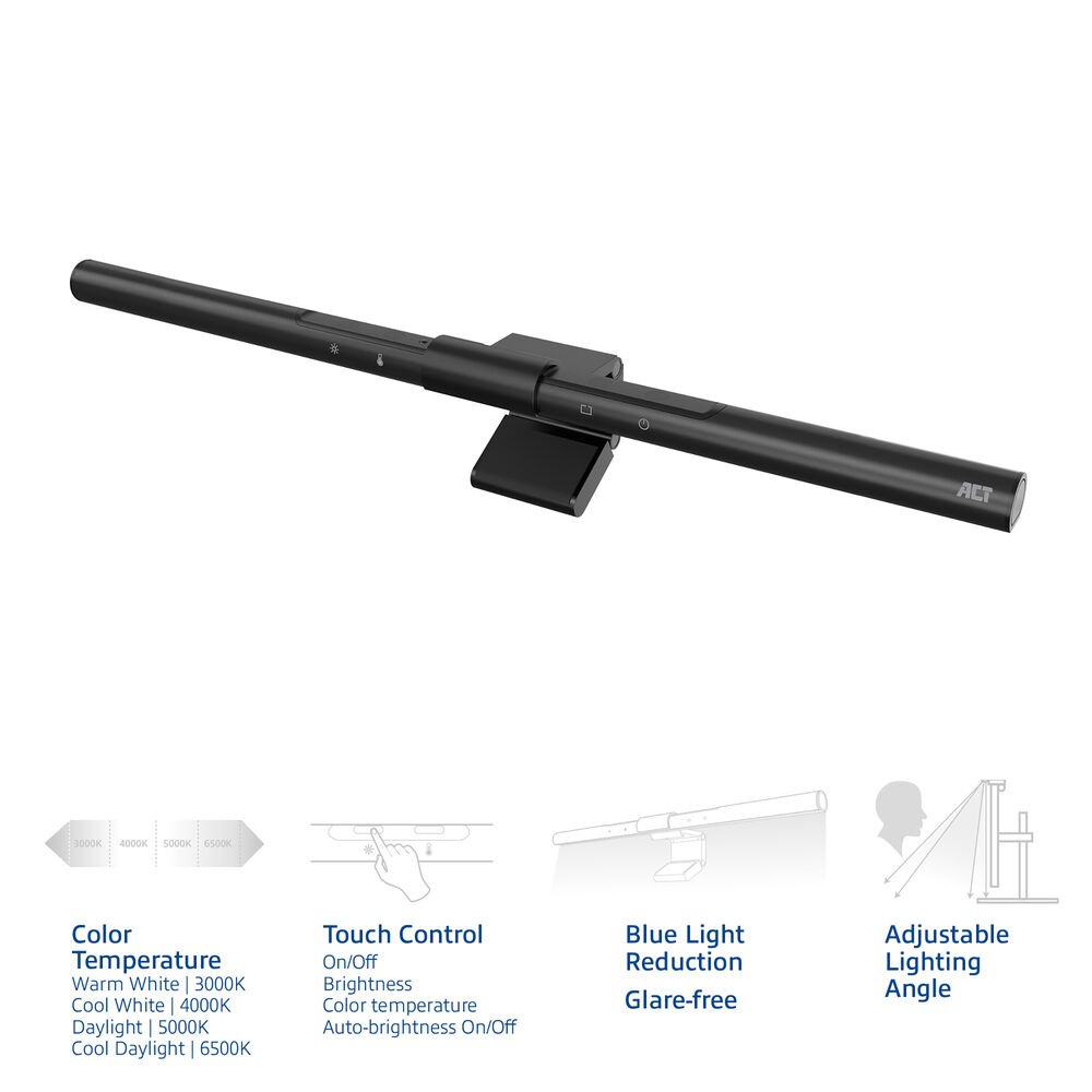 De ACT AC8055 monitor ledlamp is ontworpen voor het extra verlichten van de omgeving rondom je monitor op een bureau of werkplek, ideaal in situaties met weinig licht. Dit betreft een open box product dat nog in nieuwstaat is, waardoor je profiteert van een scherpe prijs terwijl je een lamp ontvangt die er netjes en ongebruikt uitziet. De ledlamp wordt via USB gevoed en heeft een strak ontwerp. Daarnaast kun je kiezen uit vier verschillende kleurtemperaturen: warm wit (3000K), koel wit (4000K), daglicht (5000K) en koud daglicht (6500K). Ook is de helderheid aanpasbaar waardoor je de lamp helemaal naar eigen wens kunt instellen. De geheugenfunctie onthoudt de laatst gekozen instellingen.