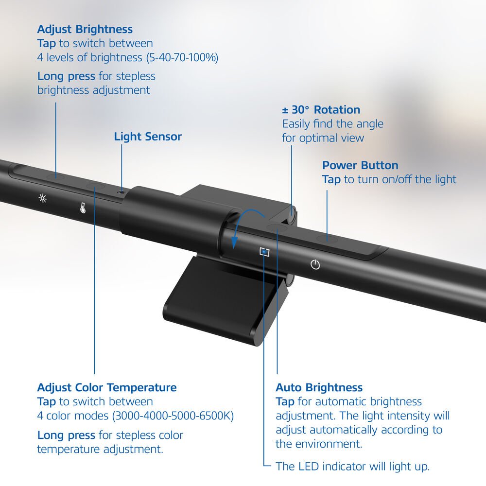 De monitor ledlamp heeft een automatische helderheid functie die zich aan het omgevingslicht aanpast. De lamp levert zelf de juiste hoeveelheid licht. Wil je dit toch liever zelf bepalen? Dan zet je deze functie heel gemakkelijk zelf uit.