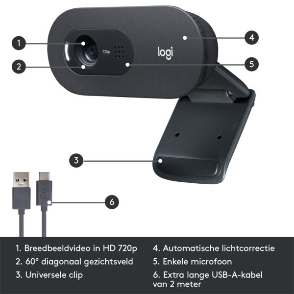 C505 basic webcam biedt meedere flexibele bevestigingsopties dankzij de extra lange USB-A kabel en universele clip; zet hem stevig vast op een laptop, desktop, of ergens anders tot op wel 2m afstand.