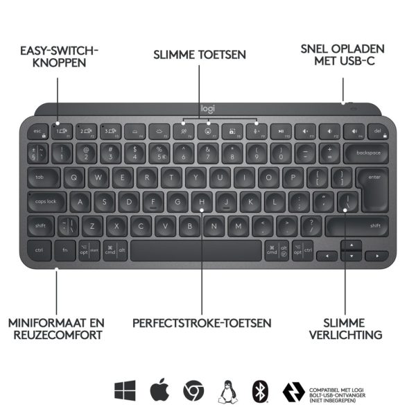 Meerdere Apparaten, Meerdere OS: Koppel het MX Keys Mini compact toetsenbord met maximaal 3 apparaten op bijna elk besturingssysteem via Bluetooth Low Energy en schakel naadloos tussen de apparaten.