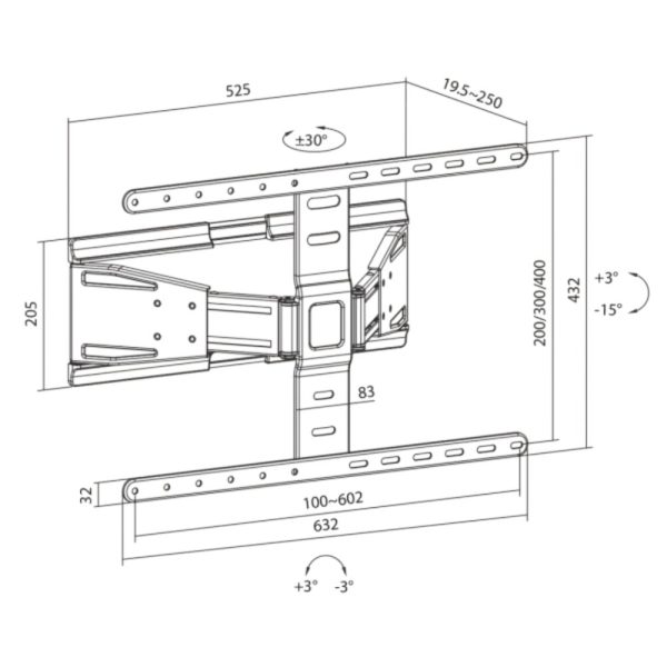 Met een minimale afstand tot de muur van 19,5 mm en een maximale uitschuiflengte van 250 mm biedt de beugel flexibiliteit in positionering. De kantelfunctie van +3° tot -15° en de draaifunctie van +30° tot -30° zorgen ervoor dat je altijd de optimale kijkhoek kunt instellen. Daarnaast is er een niveau-instelling van +3° tot -3° voor een perfecte uitlijning.