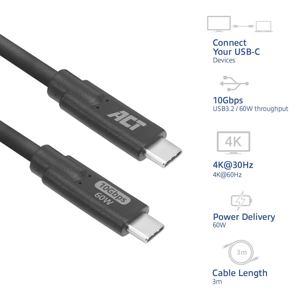 De AC7443 USB-C-kabel kan overweg met zowel data, power en video. De kabel ondersteunt de USB 3.2 technologie en voor een maximale overdrachtssnelheid tot 10Gbps.