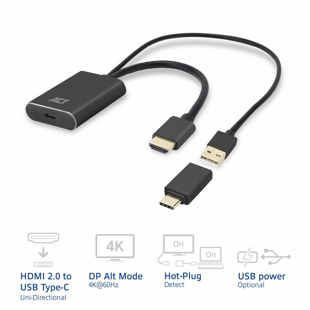 De ACT AC7537 HDMI naar USB Type-C®-adapter is een actieve uni-directionele converter om een laptop met HDMI te verbinden met een USB Type-C®-monitor. De AC7537 adapter ondersteunt een resolutie tot 3840×2160 (4K) @60Hz en heeft een USB-A/USB Type-C®-kabel voor extra stroom wanneer dit nodig is. Dankzij de hot-plug detectie is deze adapter plug-and-play te gebruiken.