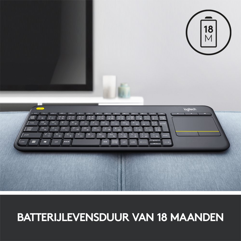 Dankzij het compacte formaat van de Logitech K400 Plus, past deze gemakkelijk op je schoot of op een tafel. Het toetsenbord heeft een QWERTY-indeling met Nederlandse toetsen, waardoor je snel en gemakkelijk kunt typen. Het touchpad heeft ook speciale functies, waaronder scrollen en zoomen, waardoor je snel en efficiĂ«nt door pagina’s kunt navigeren.