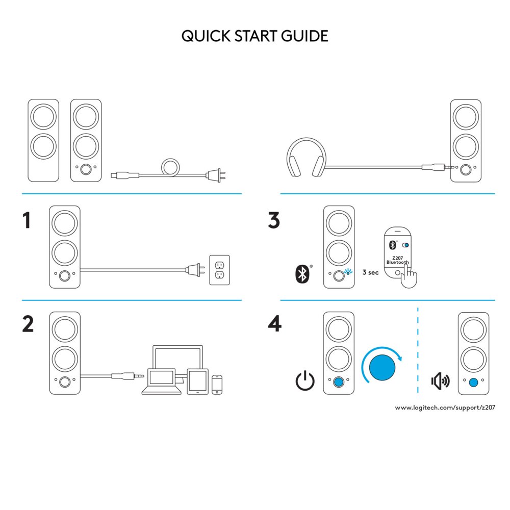 Logitech® Z207 Bluetooth® Computer Speakers bieden 10 watt piekvermogen/5 watt RMS voor rijk stereogeluid aan je bureau. Elke speaker heeft één actieve/aangedreven driver die het volledige geluidsbereik levert, en één passieve radiator voor een groter bassbereik. Stream draadloos audio via twee Bluetooth-apparaten of verbind één apparaat via de 3,5mm-ingang. Met Easy-Switch™ van Logitech kun je naadloos schakelen tussen geluidsbronnen. Druk op de ene bron op pauze en speel het geluid af op de andere. Vooraan op de rechterspeaker kun je gemakkelijk bij de knop voor Bluetooth-koppeling, de Aan/uit- en volumeknoppen en de hoofdtelefoonaansluiting.