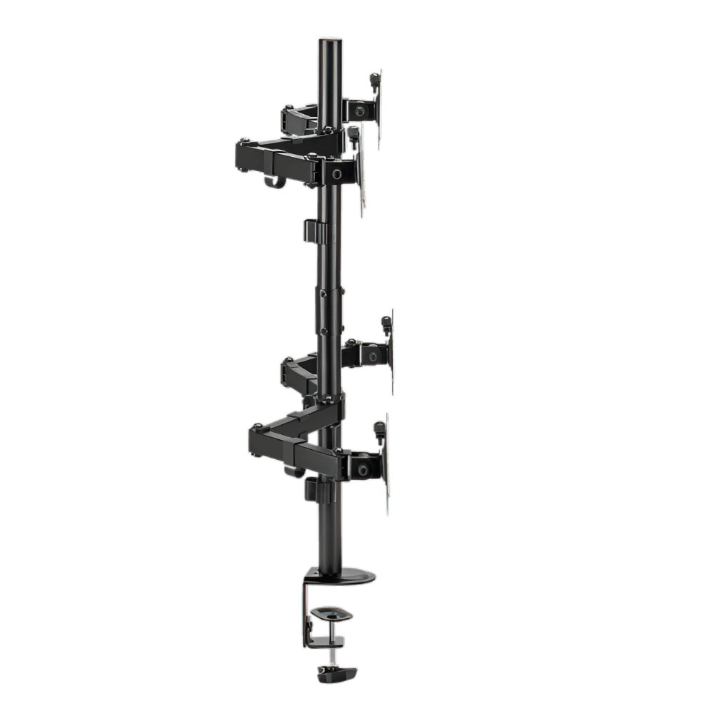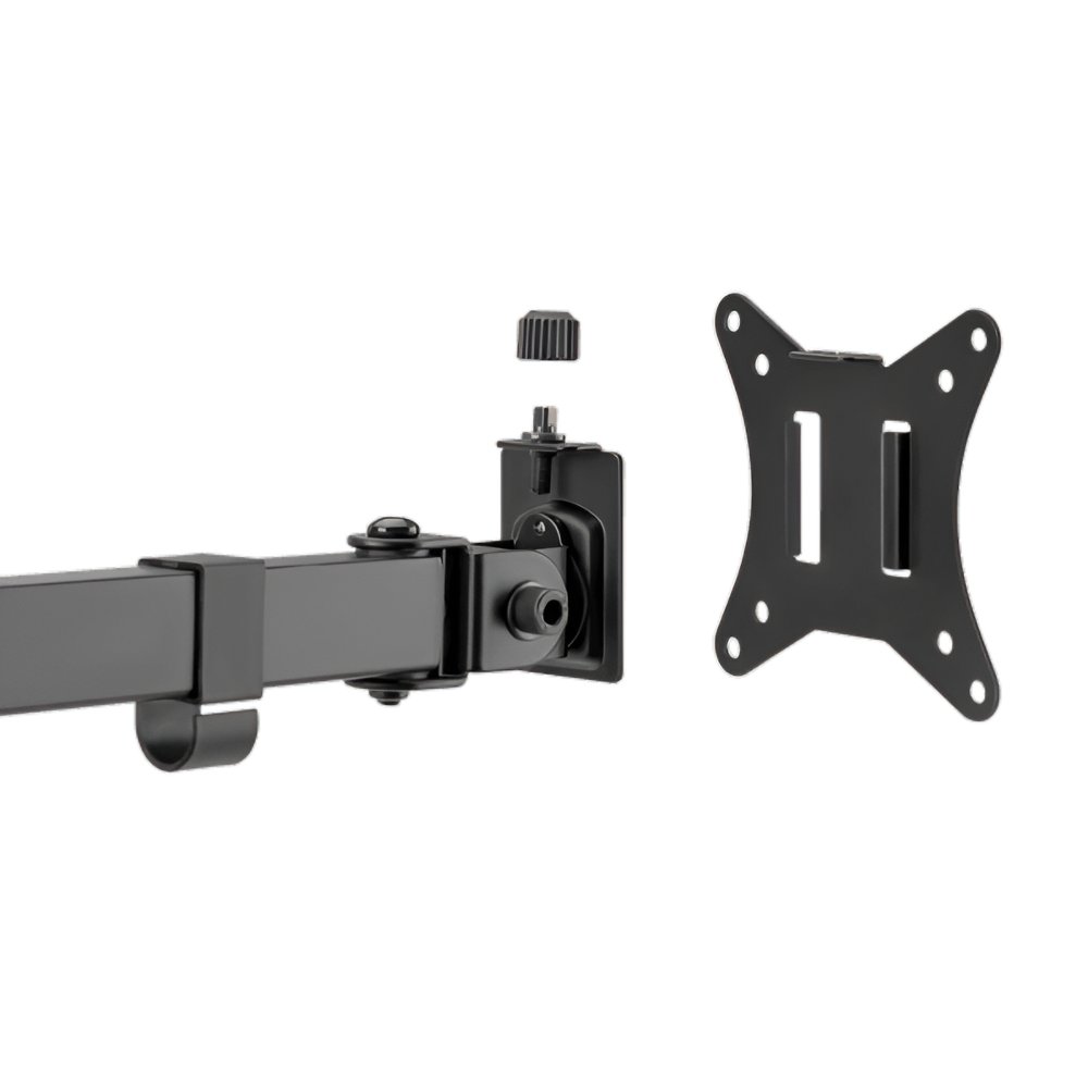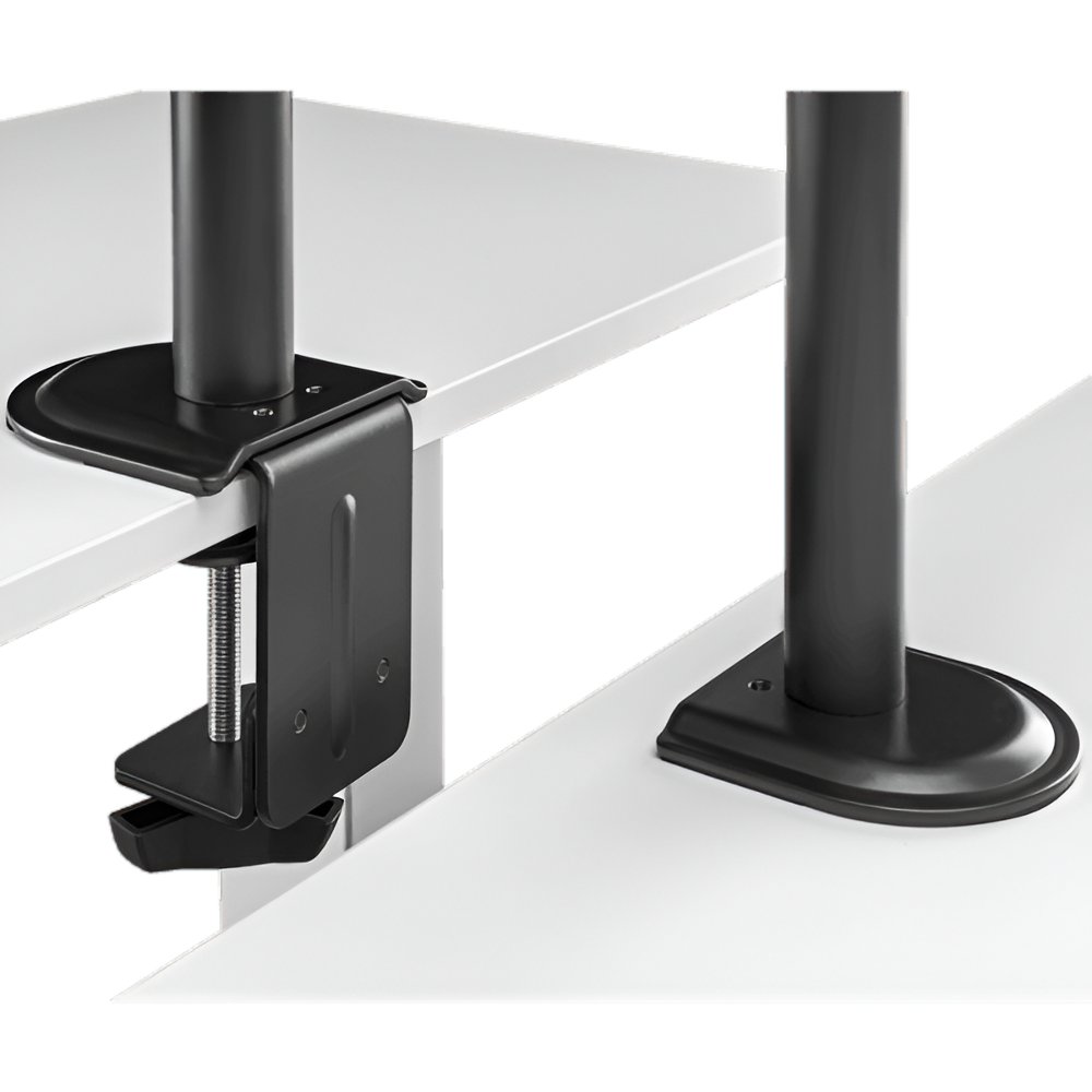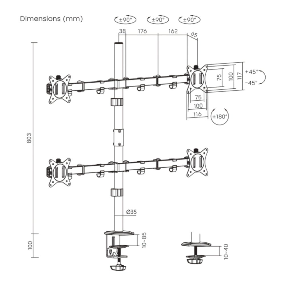 De beugel is vervaardigd uit duurzaam staal en kunststof met een zwarte poedercoating, wat zorgt voor een moderne uitstraling die past in elke werkomgeving. De armen zijn volledig verstelbaar, met een kantelbereik van +45° tot -45°, een draaibereik van +90° tot -90°, en een rotatiecapaciteit van +180°, waardoor je de monitoren eenvoudig kunt aanpassen aan je ideale kijkhoek. De hoogte van de centrale paal is 803 mm, en de armen hebben een bereik van 376 mm, wat flexibiliteit biedt in de positionering van je monitoren.
